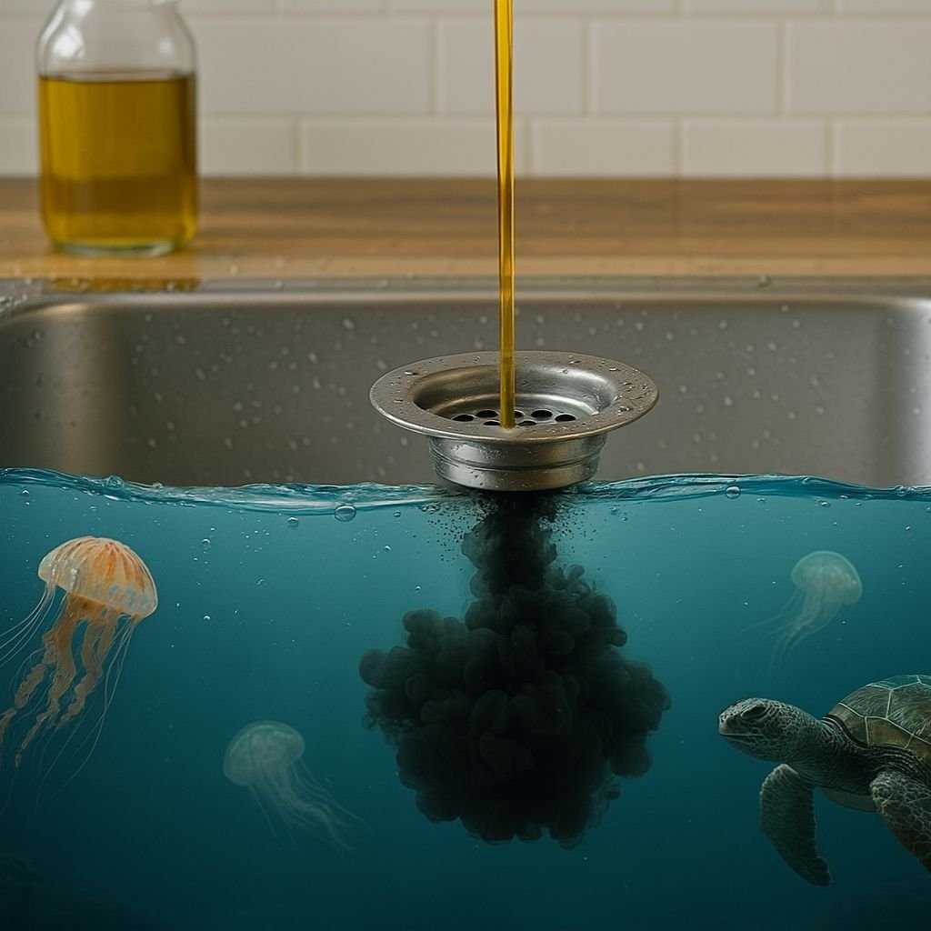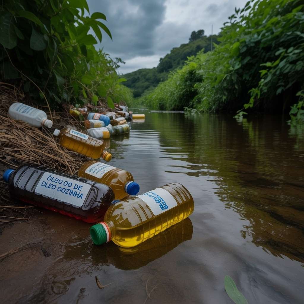 Cada litro de óleo descartado no ralo pode poluir até 25 mil litros de água, contaminando rios, solo e água potável.