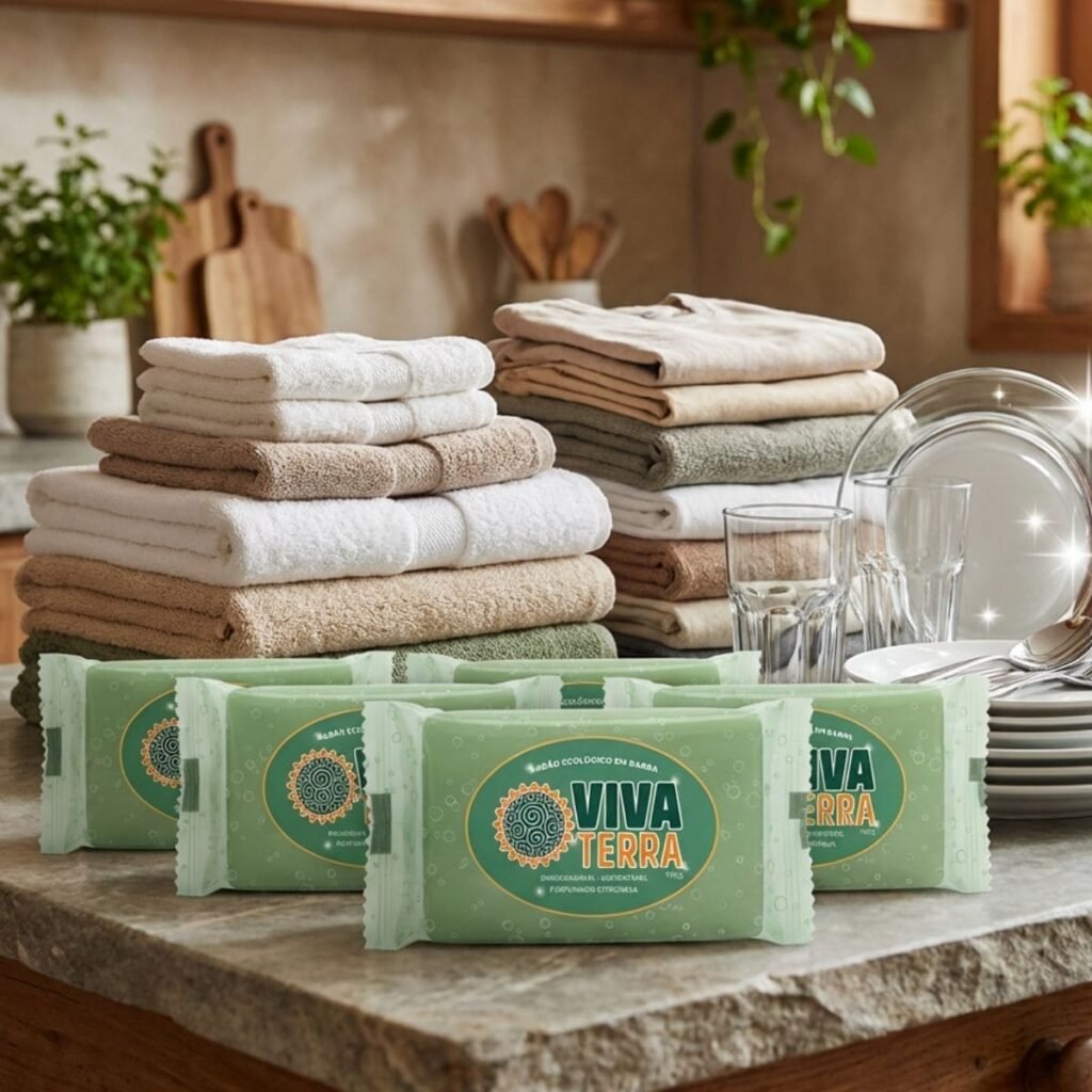 Feito 100% com óleo de cozinha reciclado, o sabão em barra VivaTerra é biodegradável, hipoalergênico e versátil. Ideal para louças, roupas, limpeza pesada ou leve — com aroma suave, espuma abundante e excelente rendimento.